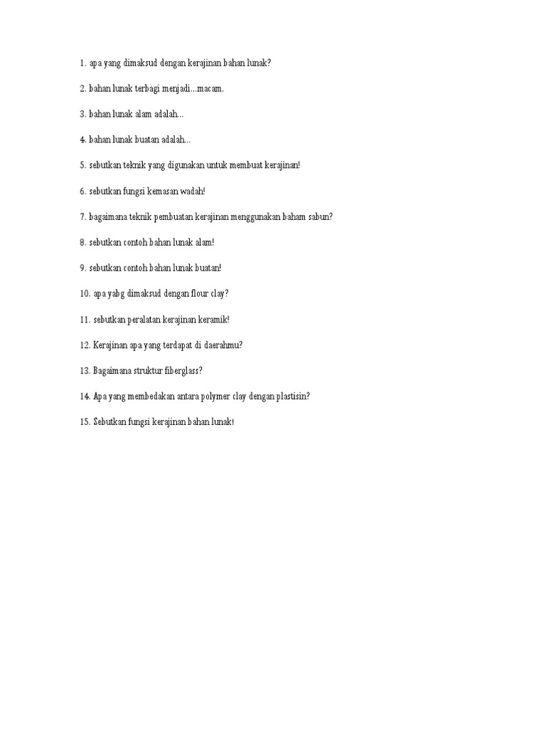 Soal soal dibawah ini mengcakup luas tentang pemahaman materi kerajinan bahan lunak mulai dari pengertian bahan yang digunakan contoh dari kerajinan bahan lunak buatan dan masih banyak lagi Silahakn baca dengan baik lalu pahami setiap soalnya