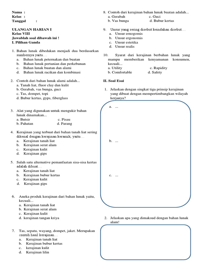 Salah satu ciri KERAJINAN berbahan lunak adalah, Teknik pembuatan kerajinan Bahan Lunak alami dan buatan, Jelaskan tentang bahan buatan untuk pembuatan produk kerajinan beserta Contohnya, Alat yang digunakan untuk mengukir Bahan lunak dinamakan, Aneka produk kerajinan dari Bahan lunak yaitu, kecuali, Bahan lunak alam adalah bahan yang berasal dari, Berikut ini jenis Bahan lunak alami adalah, Sebutkan 5 contoh kerajinan bahan lunak, Syarat dari KERAJINAN berbahan lunak yang mampu memberikan Kenyamanan konsumen kecuali, Gambar produk kerajinan Bahan Lunak, Sumber daya produksi kerajinan berbahan lunak, kecuali, Bahan lunak dibedakan menjadi dua berdasarkan sumbernya yaitu,